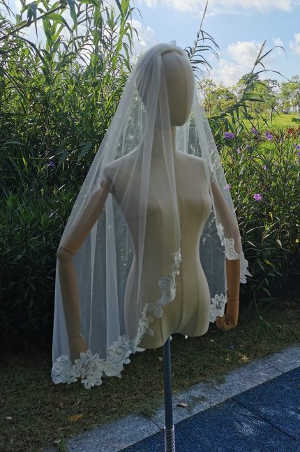 Simple 1 tier corded beading floral lace appliques short fingertip wedding veil V636B