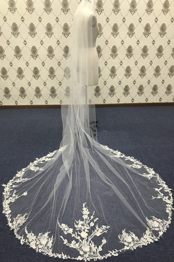 1 tier soft tulle ivorycathedral floral lace applique veil V901