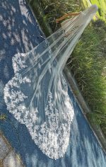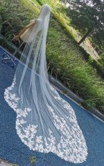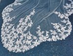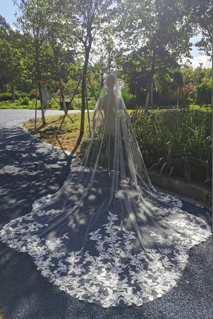 The sparking sequins vintage lace appliques scattered on the bottom part of this gossamer tulle royal length wedding veil. There is a good quality silver comb for easy securing on your big wedding day. It must be a showstopper at your big wedding day.